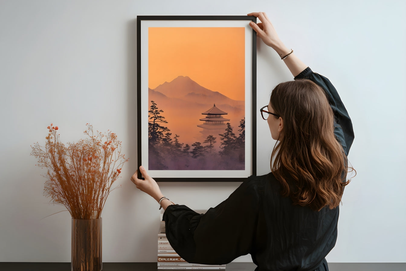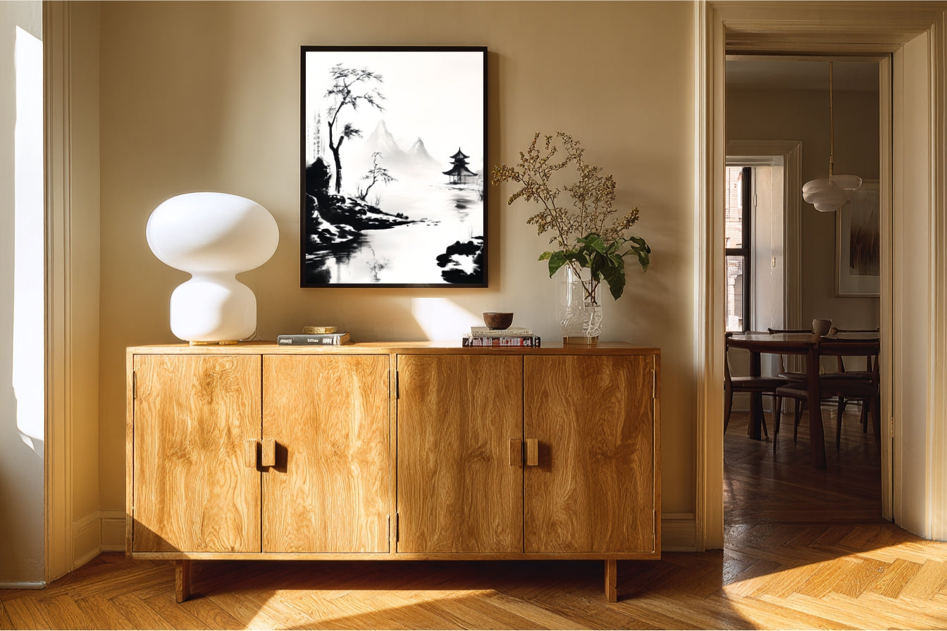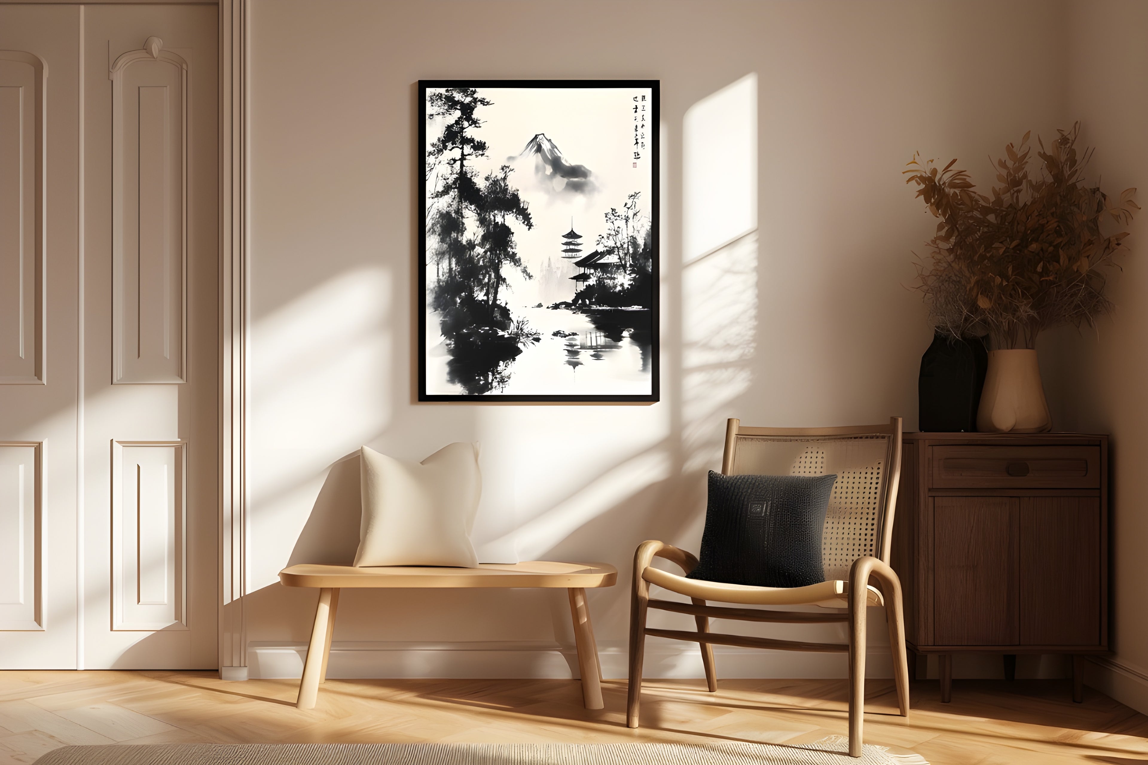 Black and White Japanese Zen Art - Secluded Pavilion in Misty Mountains - Minimalist Landscape Print for Meditation Room Decor